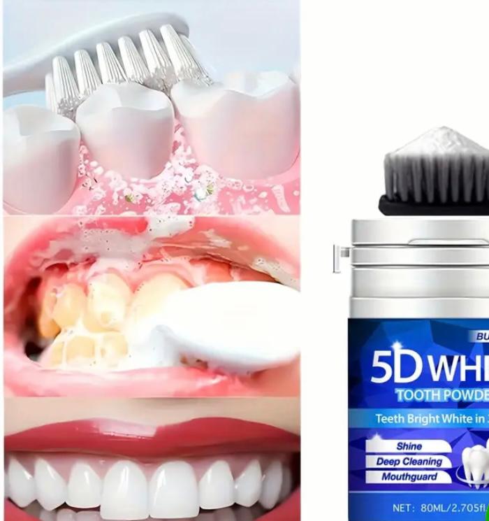5D White Tooth Powder offers an advanced deep-cleaning formula designed to remove stains, freshen breath, and reveal a naturally whiter smile. It helps lift discoloration caused by coffee, tea, or smoking while maintaining strong, healthy teeth.